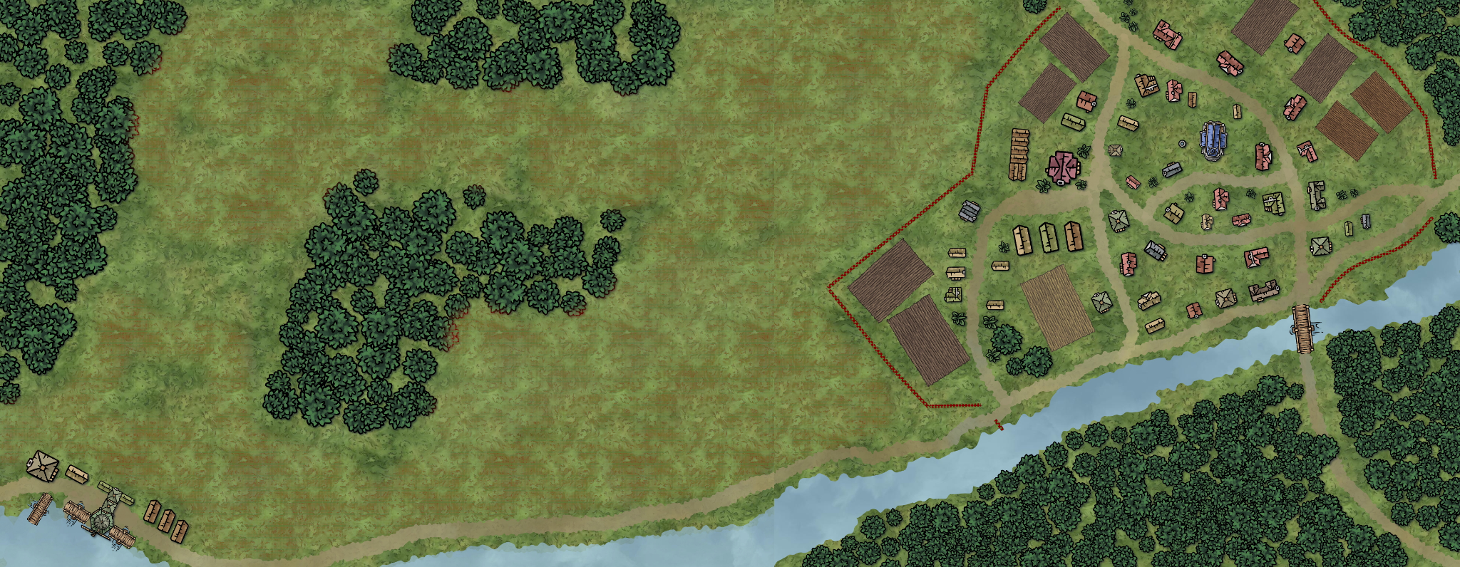 The town features 54 buildings, 6 of which make up the lumber mill, and 9 plots of farmland. The town is located on the edge of a temperate forest. There is now large swaths of grassland where trees have been cut for use in the lumber mill. Located along the southern side is an un-named river, flowing from east to west, and eventually connecting to the Re'noan bay.